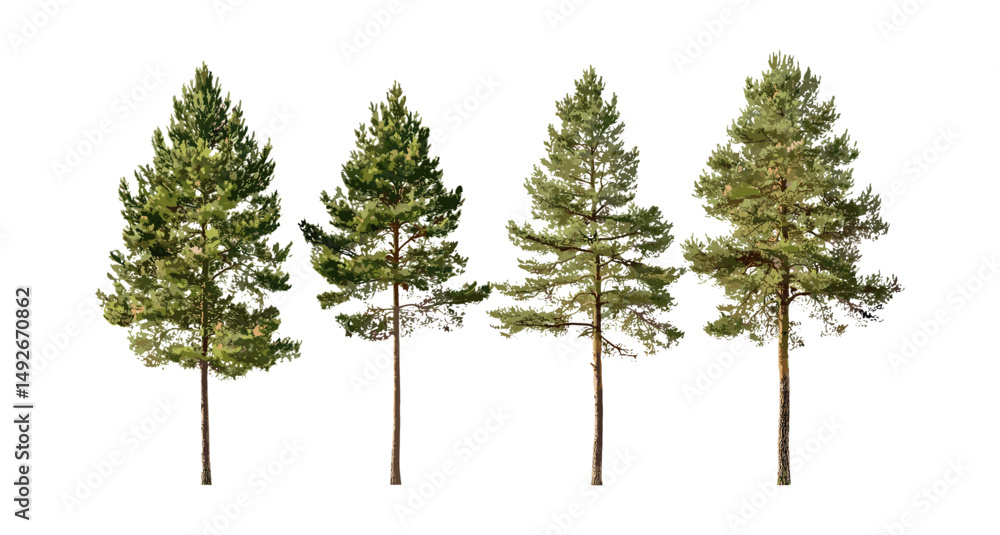 Obraz na plátně Set of Pinus sylvestris tree vector illustration, Scots pine, Baltic pine, European red pine, Scotch pine isolated cutout, forest flora, coniferous evergreen, nature art