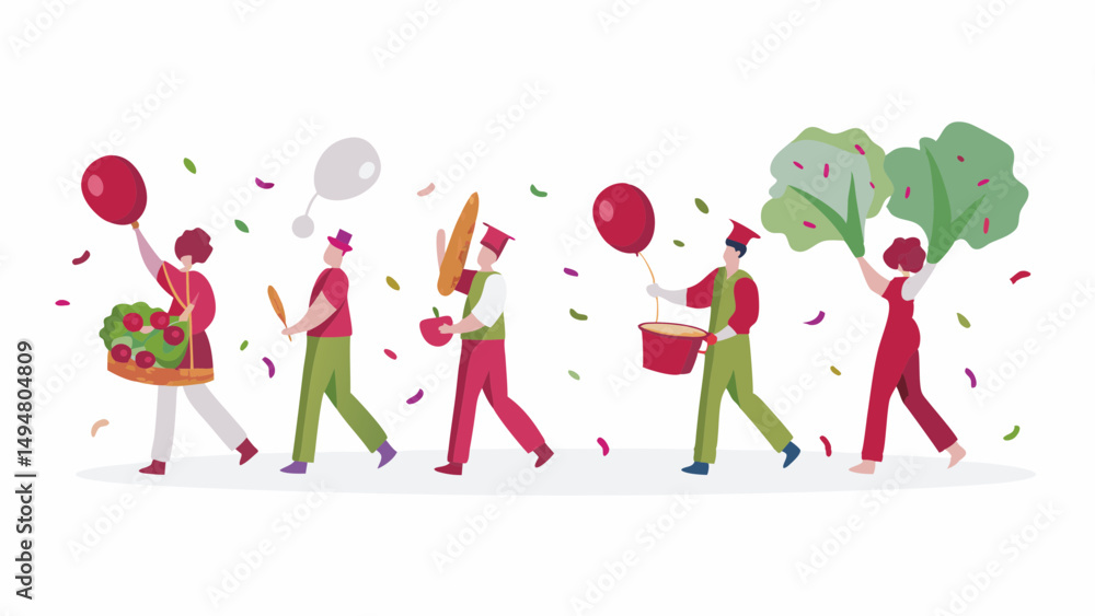 Obraz na plátně Group of people in costumes walking in a parade with balloons and food, celebrat
