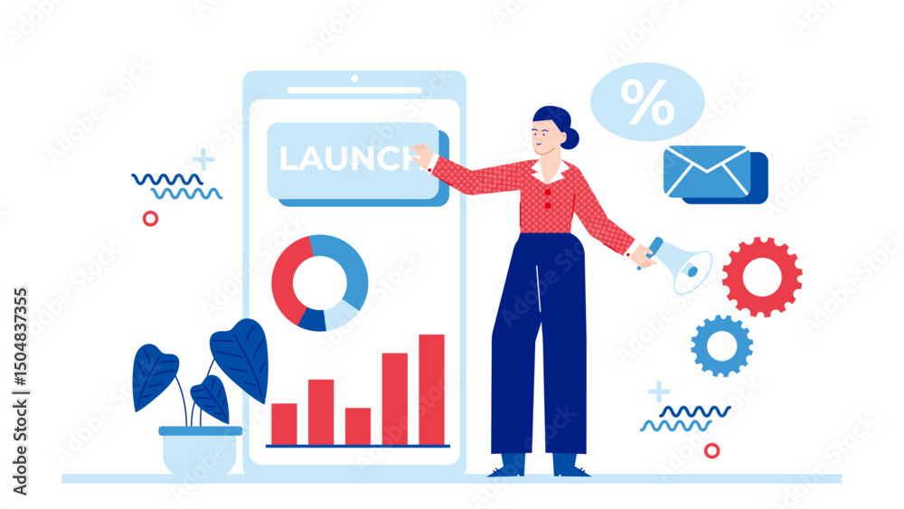 Obraz na plátně Woman excitedly launching a product, suitable for business or marketing concepts, social media campaigns, product launches, and entrepreneurship illustrations