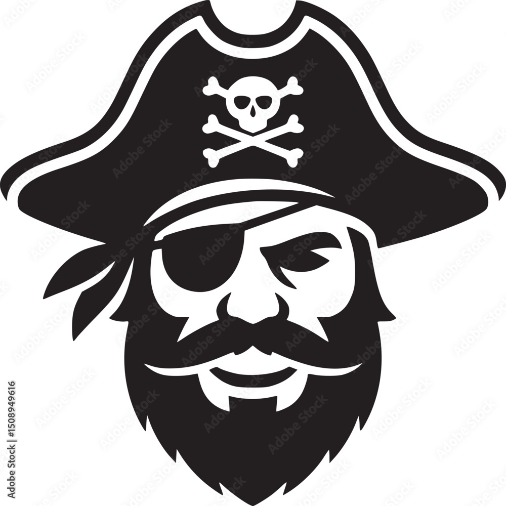 Obraz na plátně A black and white graphic of a pirate with a beard wearing a hat and an eyepatch