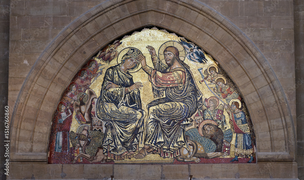 Obraz na plátně Medieval mosaic 'Coronation of the Virgin with Angels and Evangelist Symbols' in Florence Cathedral, Italy, by Gaddo Gaddi, 13th century
