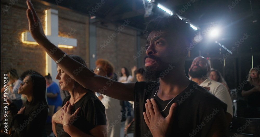 Obraz na plátně African American man in emotional worship, hand raised and over heart, glowing c