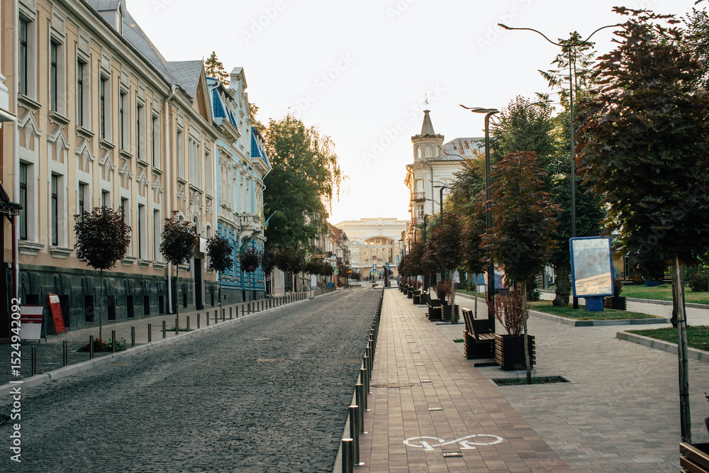Obraz na plátně Empty city street with benches and trees at sunrise