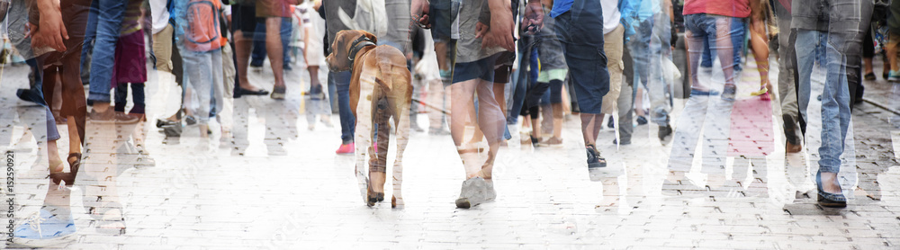 Obraz na plátně City walk, double exposure of a large crowd of people and a dog, abstract panora