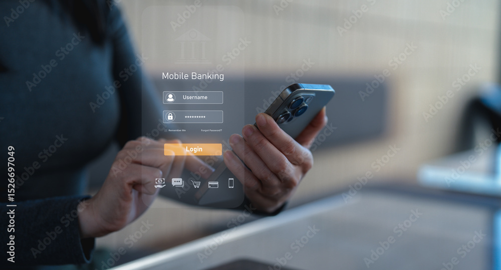 Obraz na plátně A person accesses mobile banking on a smartphone, entering login credentials on a transparent digital interface