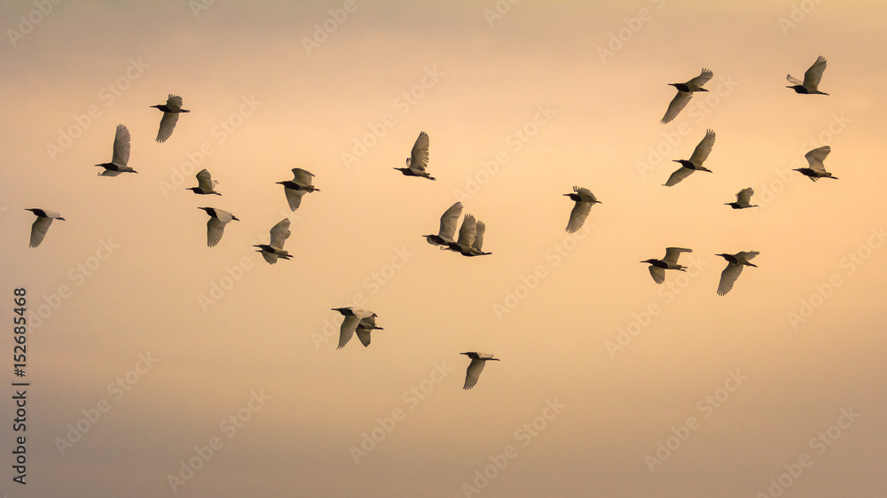 Obraz na plátně A flock of seagulls in the sky at sunset