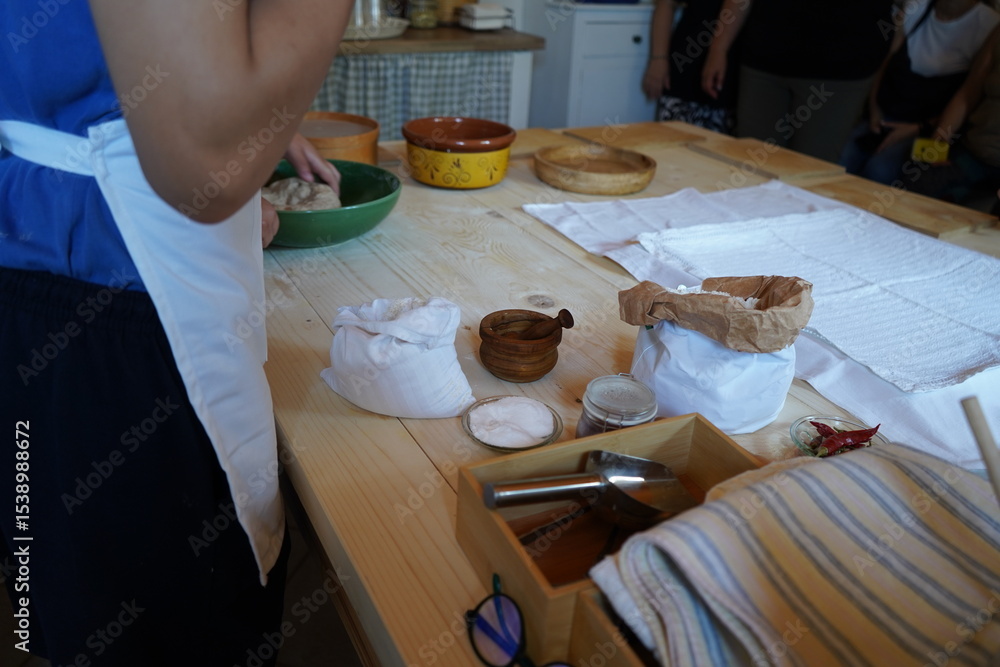 Obraz na plátně A traditional Greek kitchen scene preparing topia, a wartime survival food made by mothers during the Occupation—flour, salt, and simple tools recall resilience and cultural memory