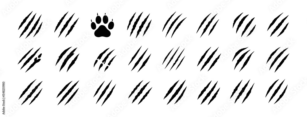 Obraz na plátně Claw scratches mark set, cat tiger paw scratch shape, animal trace isolated on white, wild predator damage, feline attack, scary slashes, vector illustration, png