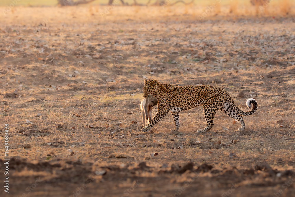 Obraz na plátně Side profile of leopard with monkey in mouth