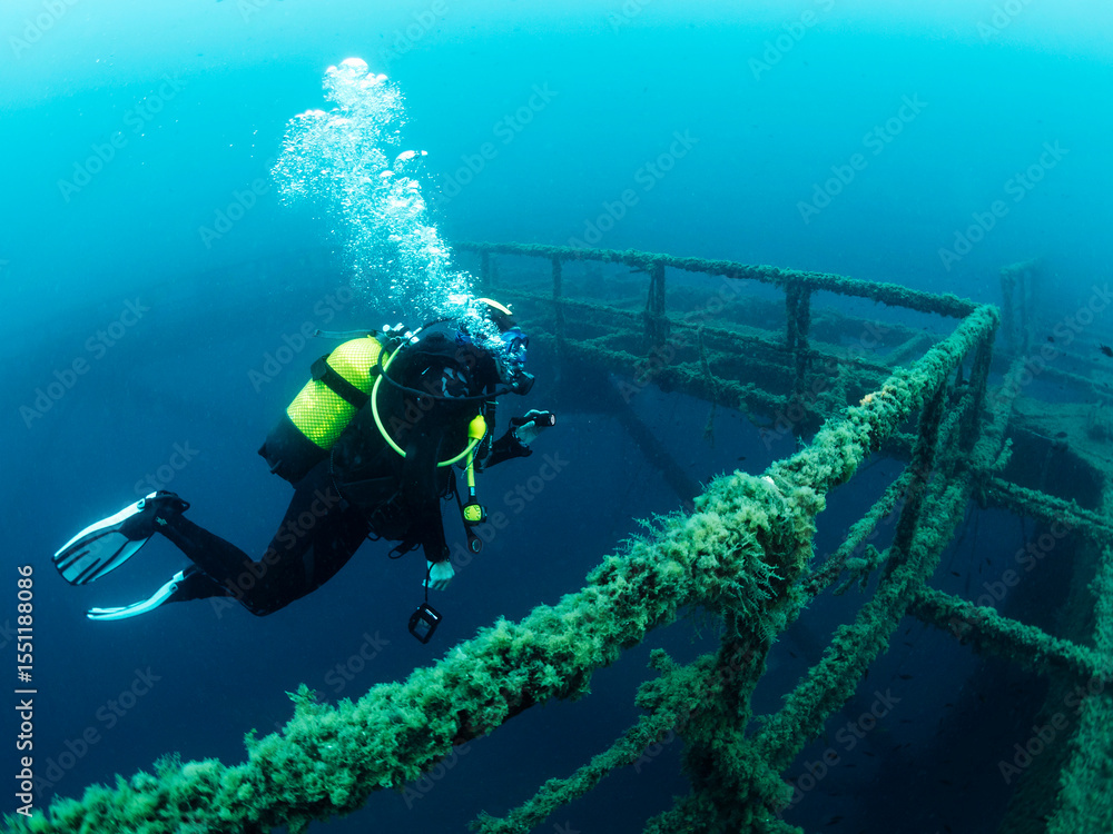 Obraz na plátně diver diving next to the wreck of a structure submerged in the sea colonized by