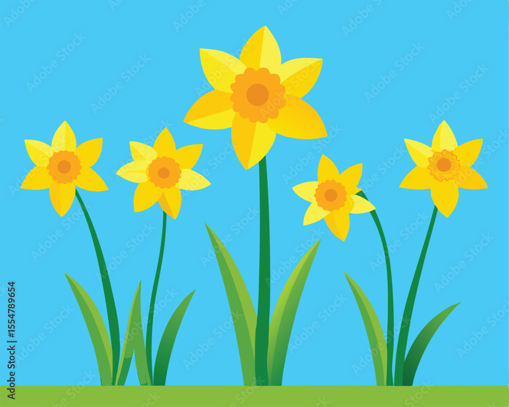 Obraz na plátně Vector art of five cheerful yellow daffodils in full bloom against a bright blue