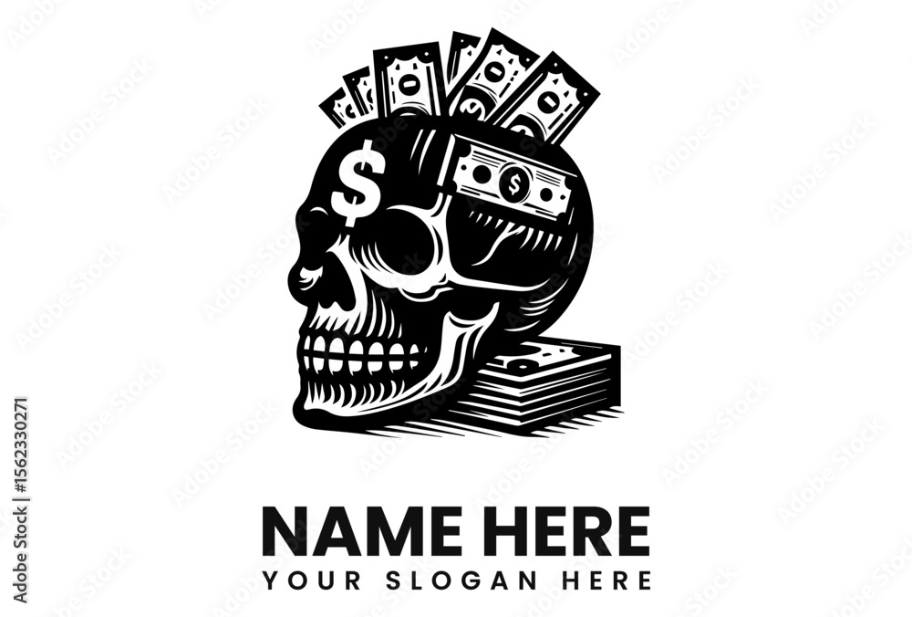 Obraz na plátně Graphic image of a skull with money inside and on top of it, black and white