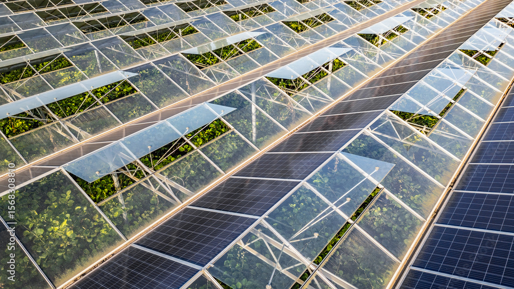Obraz na plátně Sustainable greenhouse with rooftop solar panels bathed in morning sunlight for eco-friendly vegetable farming and renewable energy generation in a dual-use agricultural system