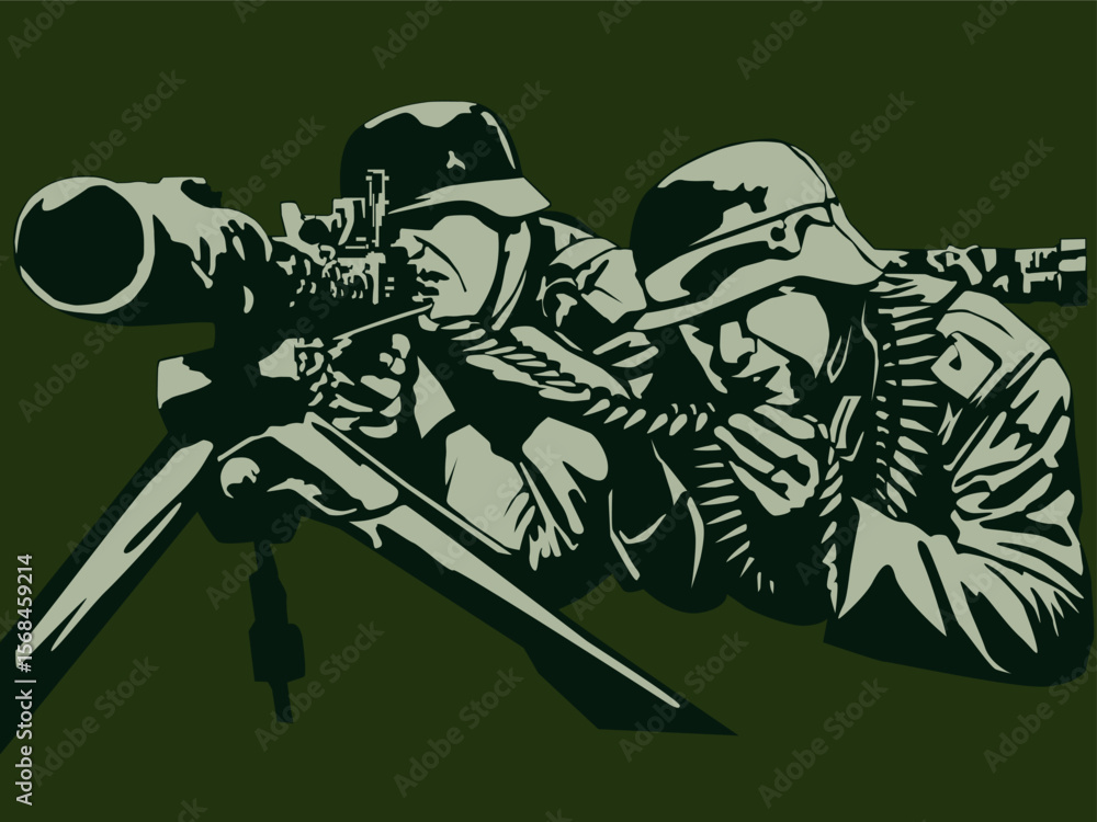 Obraz na plátně Machine gun crew from World War II on a green background, vector illustration depicting soldiers firing a machine gun
