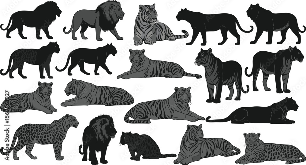 Obraz na plátně Set of wild big cats including lions, tigers, panthers, jaguars in various poses