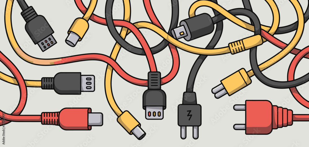 Obraz na plátně A tangled mess of colorful electronic cables and connectors on a light backgroun