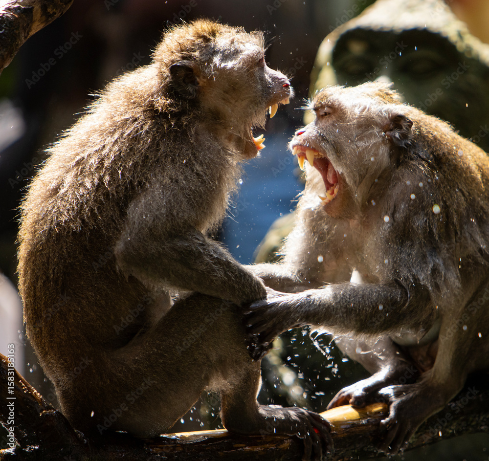 Obraz na plátně Long-tailed macaque monkeys fighting in the Sacred Forest Sanctuary in Ubud, Bali, Indonesia