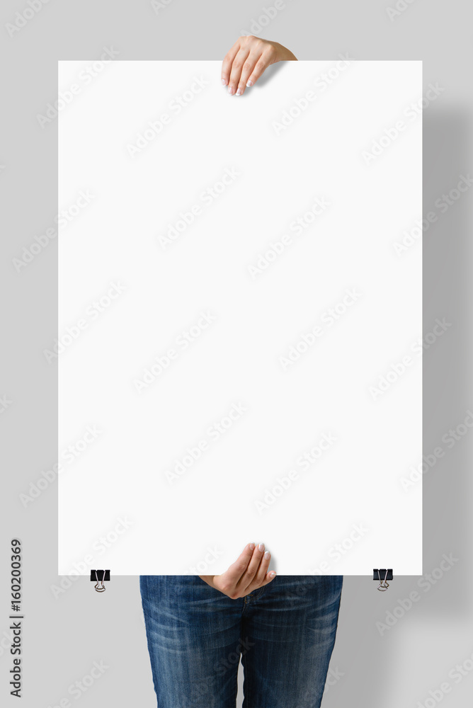 Obraz na plátně Woman holding a blank A1 poster mockup isolated on a gray background