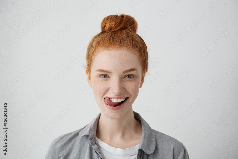 Obraz na plátně Young teenage female with ginger hair knot sticking out her tongue having funny look isolated over white background