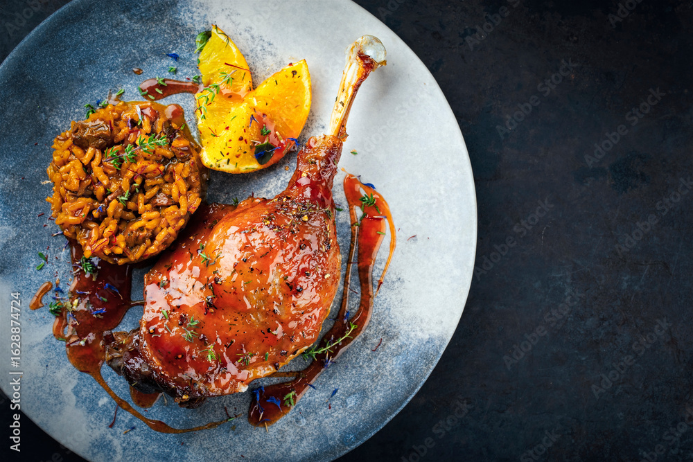 Obraz na plátně Traditional barbecue gourmet duck haunch with mushroom risotto and orange slices