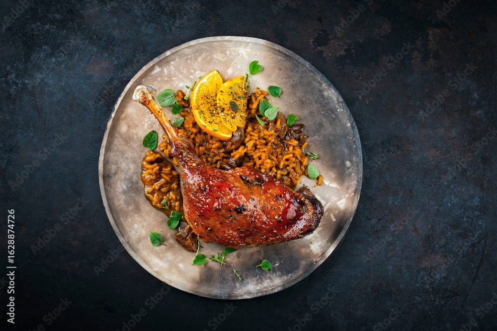 Obraz na plátně Traditional barbecue gourmet duck haunch with mushroom risotto and orange slices