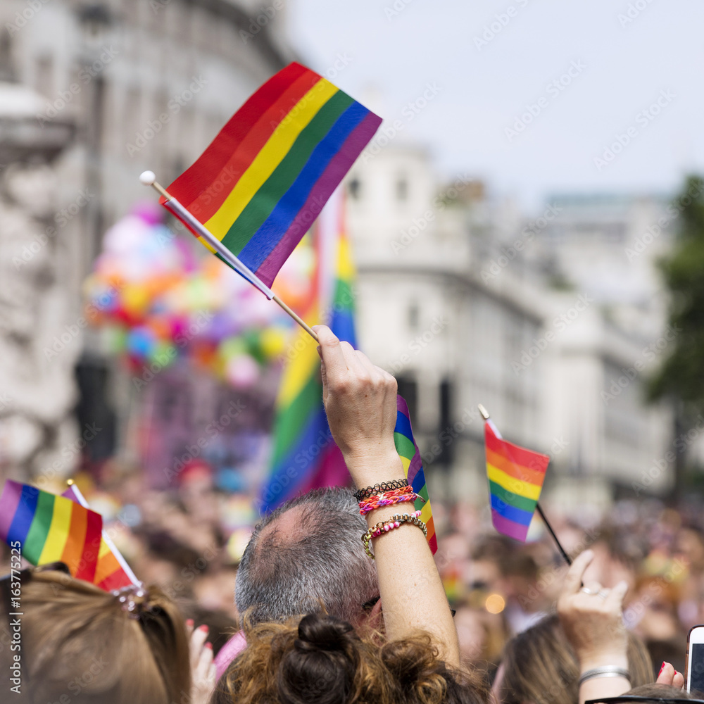 Obraz na plátně Woman's hand waving rainbow flag during pride march