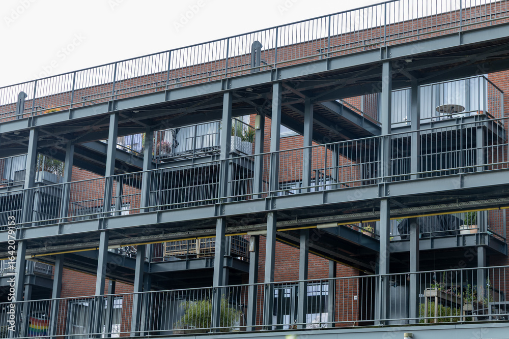 Obraz na plátně Modern apartment building with multiple balconies showcasing urban living, featu