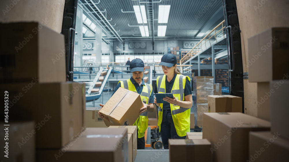 Obraz na plátně Caucasian Female Stocking Associate Using Tablet Computer To Check Inventory In Logistics Facility With Conveyor Belt