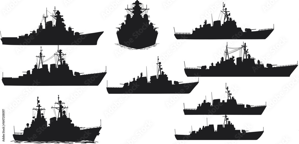 Obraz na plátně Set of warship silhouette vector illustrations, military navy ships, destroyers, battleships, combat vessels, black isolated icons for naval and maritime design