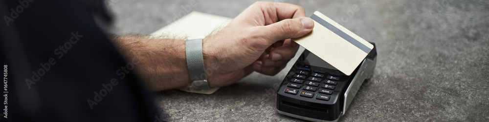 Obraz na plátně Header of anonymous man holding credit card over payment terminal in bank office