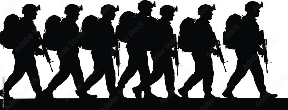 Obraz na plátně Silhouette of marching soldiers in combat gear, military troop patrol vector, ar