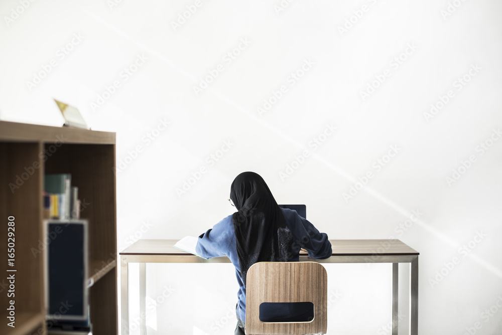Obraz na plátně Islamic girl sitting and using laptop