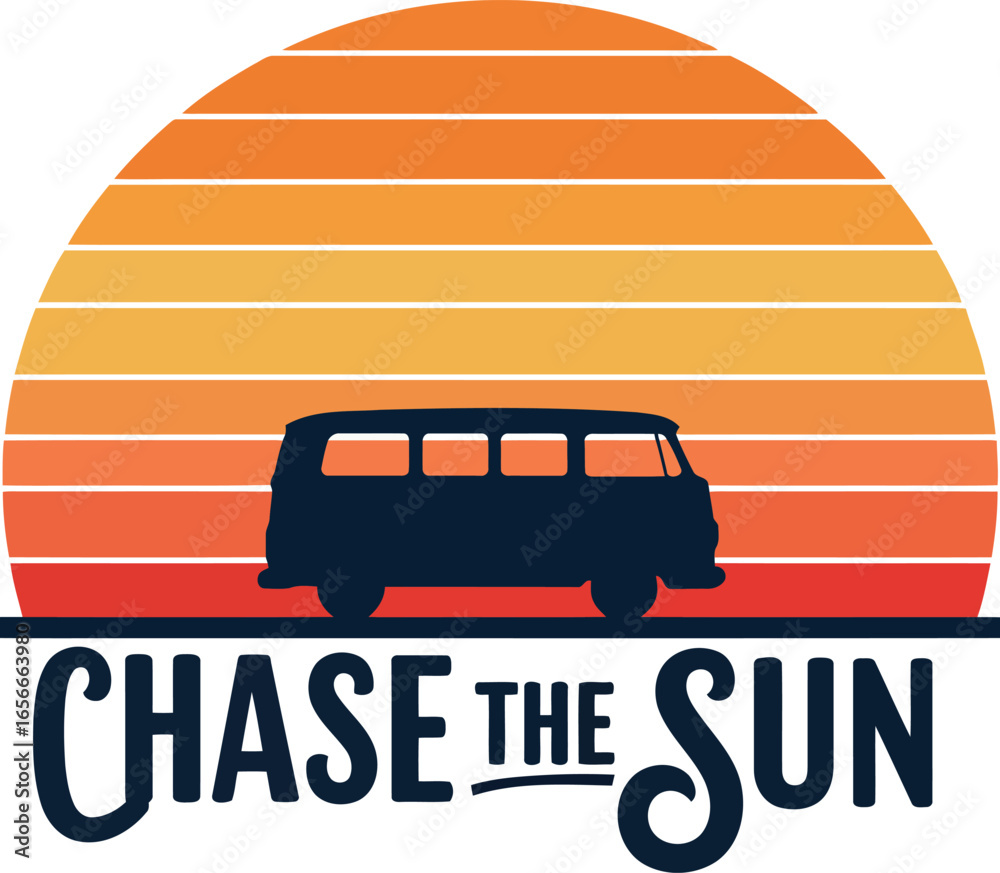 Obraz na plátně Retro van silhouetted against a vibrant striped sunset with the inspiring phrase