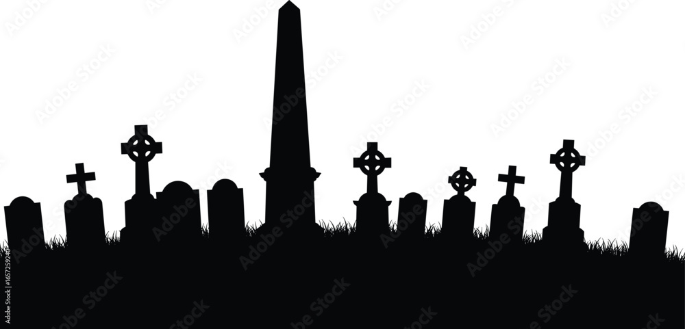 Obraz na plátně Silhouette of old graveyard with crosses, tombstones, obelisk, spooky cemetery s