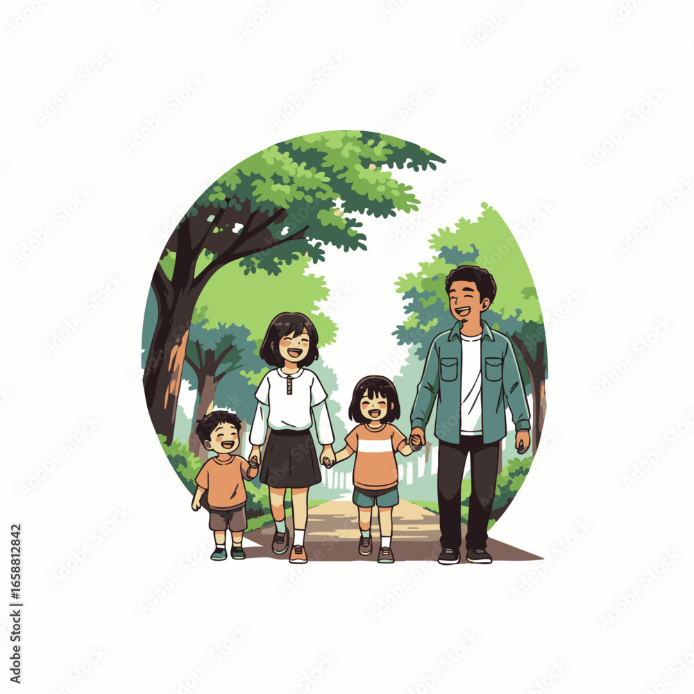 Obraz na plátně A happy family of four enjoys a leisurely stroll together on a sunny day in a park