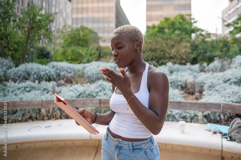 Obraz na plátně Young woman gesturing while reading a script in a park