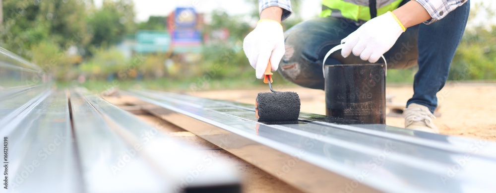 Obraz na plátně Construction worker painting steel beam with black protective coating using roller brush