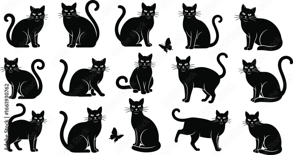 Obraz na plátně Black cat silhouette, butterfly interaction, Halloween theme, pet design, feline