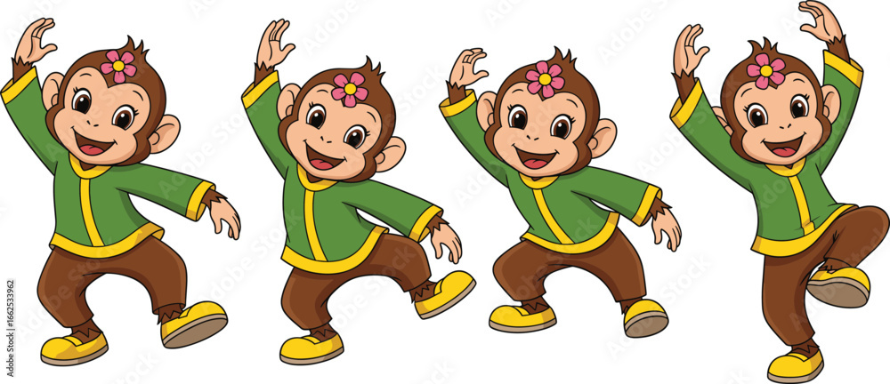 Obraz na plátně Happy cartoon monkey dancing in green jacket and brown pants, playful joyful ani
