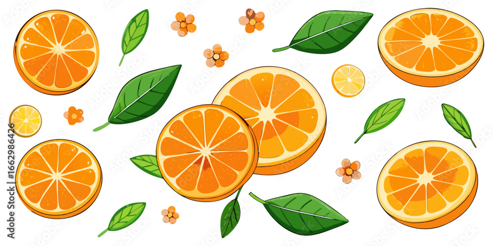 Obraz na plátně A flat lay arrangement of fresh orange slices and whole oranges on a clean white background