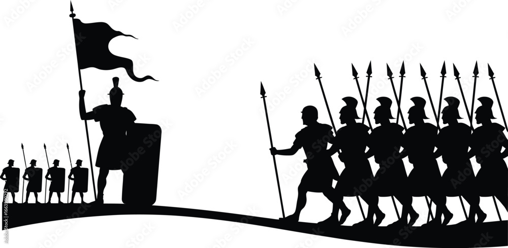 Obraz na plátně Silhouette of ancient roman soldiers marching with a leader holding a banner