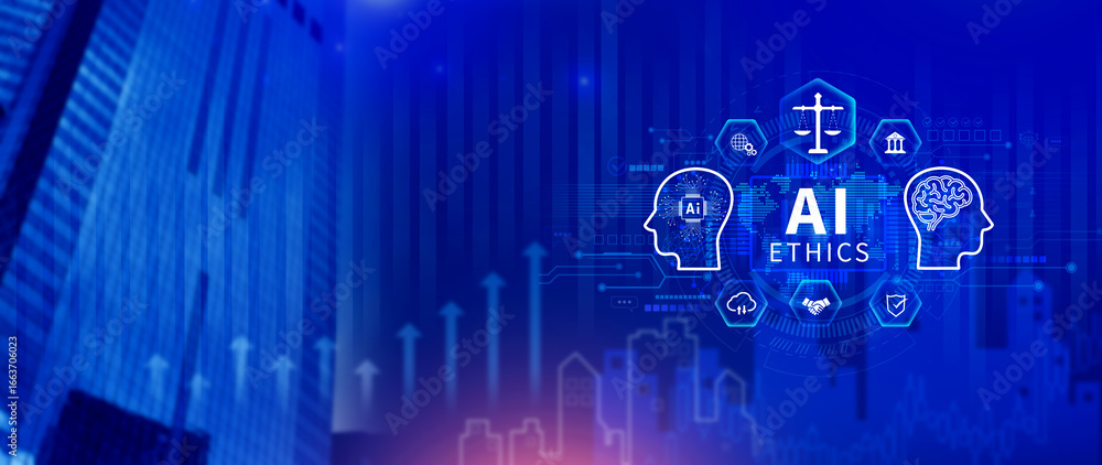 Obraz na plátně AI ethics expert guides the way, balancing artificial intelligence with humanity, Icons related AI ethics, symbols of legal scales, security, ethical standards and regulations in AI technology