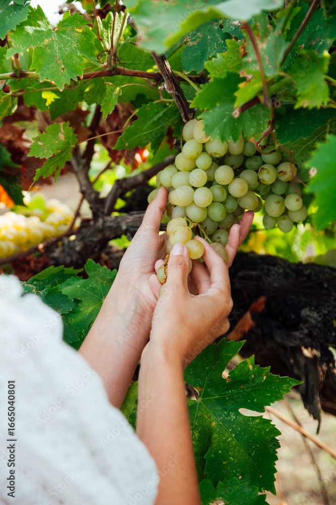 Obraz na plátně Woman picking grapes in a vineyard nice
