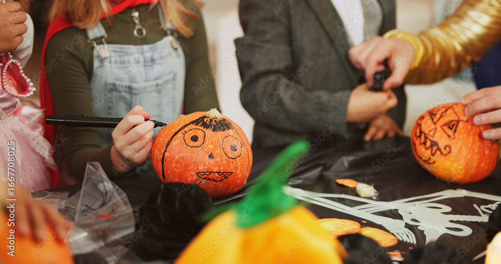 Obraz na plátně Hands, halloween and group with pumpkin, decoration and creativity with drawing, costume and party