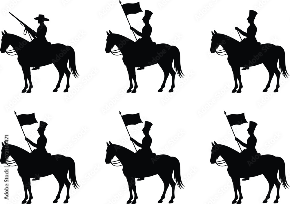 Obraz na plátně Silhouette of horse riders with flags and rifles, historic cavalry, mounted sold