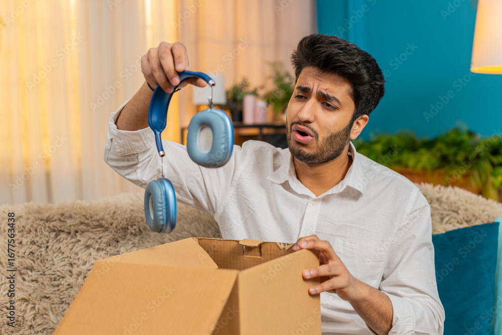 Obraz na plátně Sad Indian young man at home opening a package, shocked to find damaged wireless headphones inside