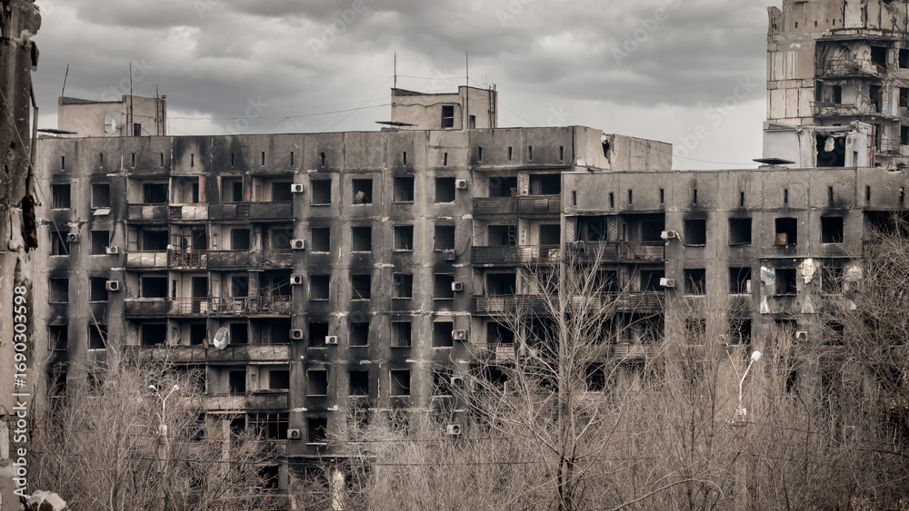 Obraz na plátně ruined street and destroyed houses in Kiev war in Ukraine