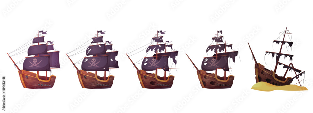 Obraz na plátně Pirate ship before and after sea battle set vector illustration