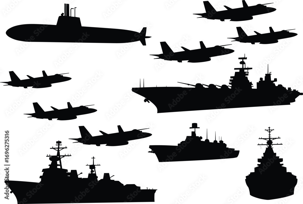 Obraz na plátně Military vehicle silhouettes, warship icons, fighter jets, submarine shape, airc