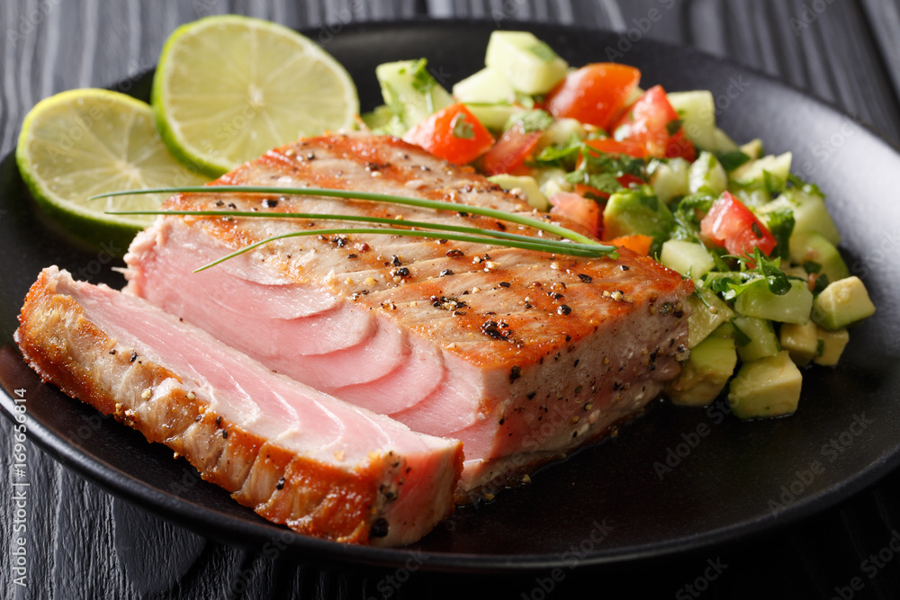 Obraz na plátně Barbecue tuna steak with lime and avocado cucumber salsa closeup